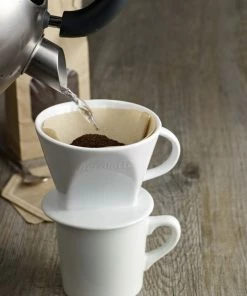 The filter is available in two sizes, the smaller one uses size 2 papers (102 or 1×2), and the larger one uses size 4 papers (1×4). The coffee filter is made from quality porcelain, and it is also dishwasher safe.