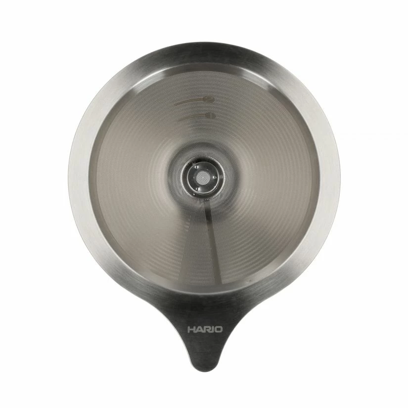 Hario Double Mesh Metal Dripper V60-01 made solely of stainless steel. The metal filters allow the coffee oil to slowly pour through along with a rich flavour. In the dripper two finely etched mesh filters overlap.