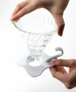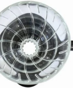 The Hario Glass V60 Coffee Dripper has the same design as all other Hario V60 coffee drippers. It consists of ridges, a large hole in the middle and the V-shape, the only difference is that this dripper is made of glass and has a removable plastic handle.