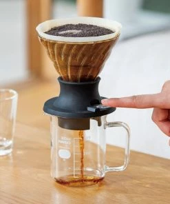 Hario Immersion Dripper Switch is a glass coffee dripper with a valve in the bottom. The dripper is the traditional V60 model, and it uses size 03 filter papers. A special steel ball closes the opening in the dripper, making it impossible for water to pour immediately to the server.