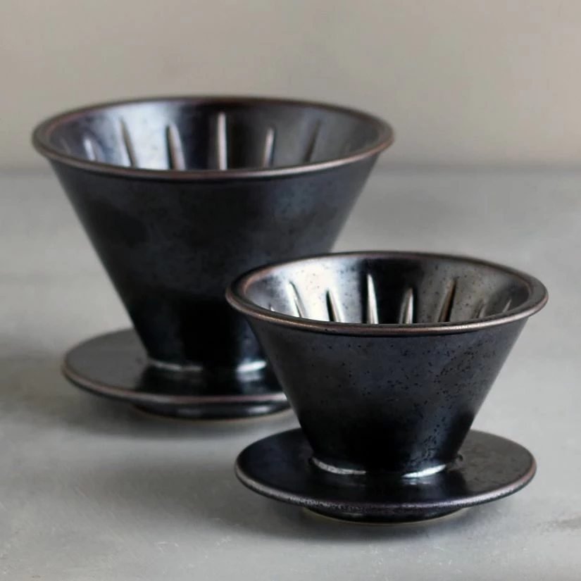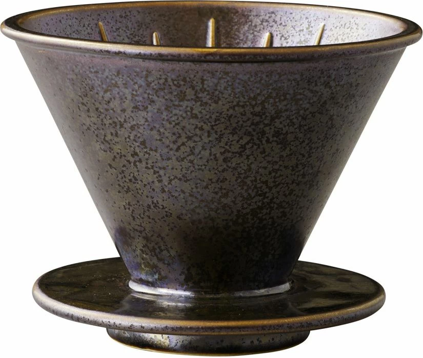 The metal like texture of the Kinto SCS-S01 Brewer for 4 cups has a bold appearance yet gives a sence of warmth when used. The shape of the coffee brewer is designed so that the top rim does not get hot and can be held without a handle. Use with conical shaped filter paper or stainless steel filter.