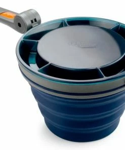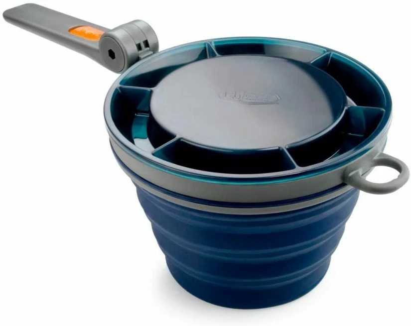 GSI Outdoor original Fairshare mealtime mug with a folding handle that locks in two places, a collapsible, silicone body which expands from an easy- packing 4.3 cm high to a generous 650 ml capacity.