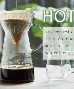 The Iced Coffee Maker is made with high quality natural components and has the ability to withstand temperatures up to 120°C. It has an inner chamber for ice, long enough to reach the bottom of the vessel, cooling the coffee, and a transparent silicone ring to place the V60 dripper on the glass carafe.
