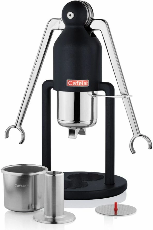 The Cafelat Robot Regular is a lever-style home espresso maker. By pushing down on levers, home brewers build up pressure inside the portafilter, dispersion screen, and basket. It uses few parts, no complicated electronics and only premium materials like stainless steel. All the parts for coffee are completely plastic free!