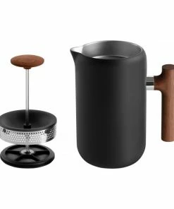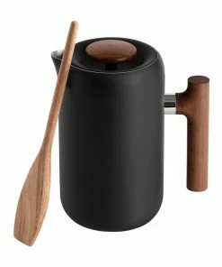 - Materials: Stainless steel body and filter, Non-stick PTFE-coated interior (PFOA-free), walnut wooden press and handle