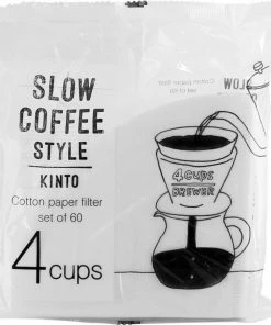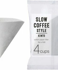 Paper coffee filters from Japanese Kinto for use in the SCS coffee drippers. The paper fits Kinto Slow Coffee Style drippers (size 4 cups), but they can also be used in Hario coffee drippers (size 02). The paper used in the filter is made of a blend of cotton pulp and wood pulp. Compared to Hario V60 papers, the Kinto paper is slightly thicker and more porous.