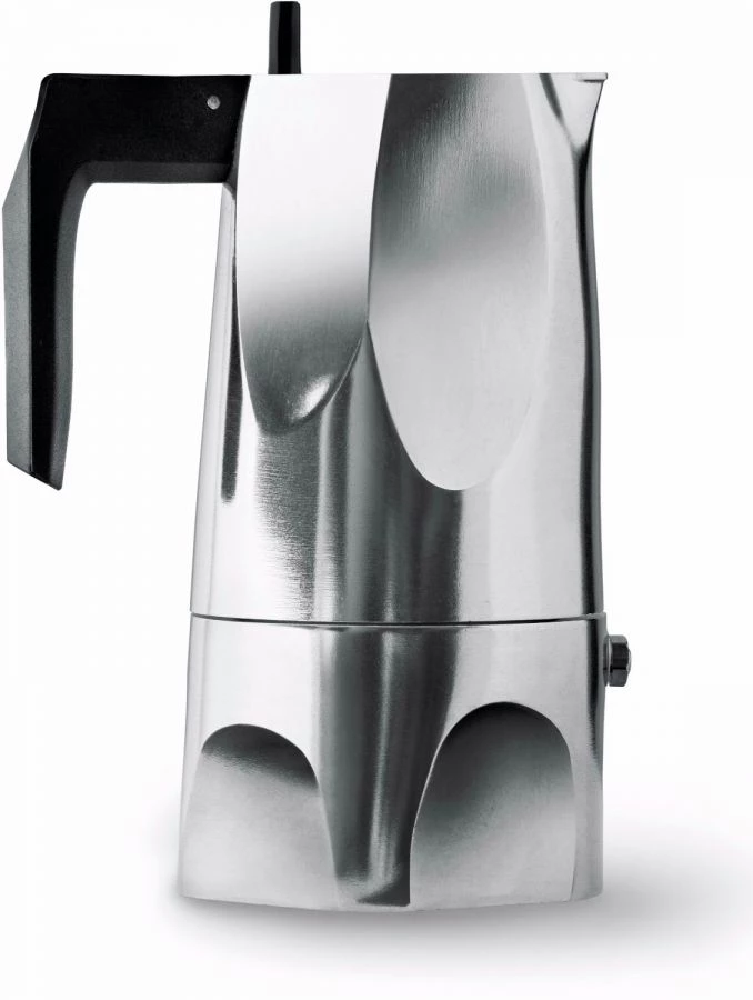 Fully aware of an object’s narrative ability, Sicilian architect Mario Trimarchi has designed Alessi’s “Ossidiana” espresso coffee maker. Like his other projects, this one is based on memories and fragments of images, told through the form of an article. “Ossidiana” embraces the memory of the various sides of the traditional moka coffee pot and those of obsidian, the volcanic stone it is named after.