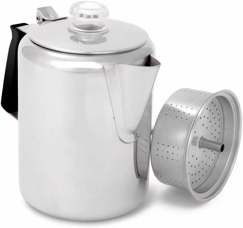 Perk up mornings at the campsite or cabin with the classic yet rugged stainless steel Glacier Perc coffee percolator from GSI Outdoors, great coffee maker for use on stove tops.