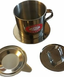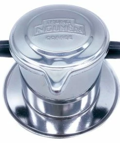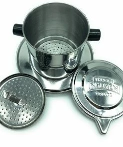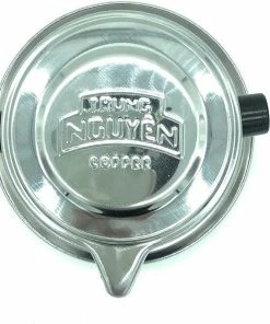 The Trung Nguyen phin filter consists of a round perforated plate, that fits over a coffee mug or cup; a brewing chamber, that sits on top of the plate; a perforated insert that fits inside the chamber, to tamp the grounds down; and a cap to keep the heat in.