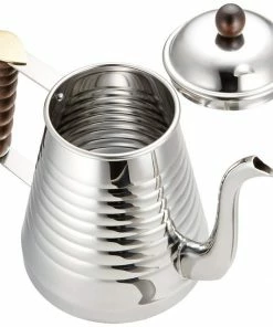 The Kalita Wave Pot is a stainless steel water kettle for making pour over coffee. The gooseneck spout restricts the flow of water, giving you complete control over your pouring rate and the ability to pour exactly where you want. The wooden handle and brass thumb-rest remain cool for easy handling.