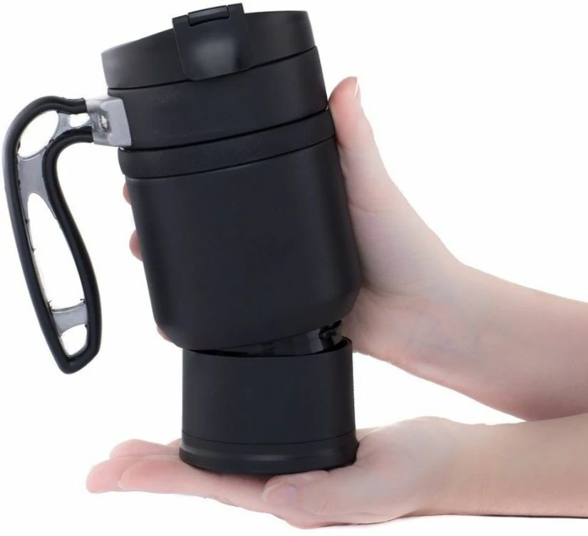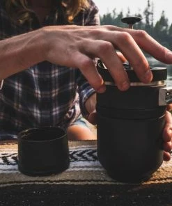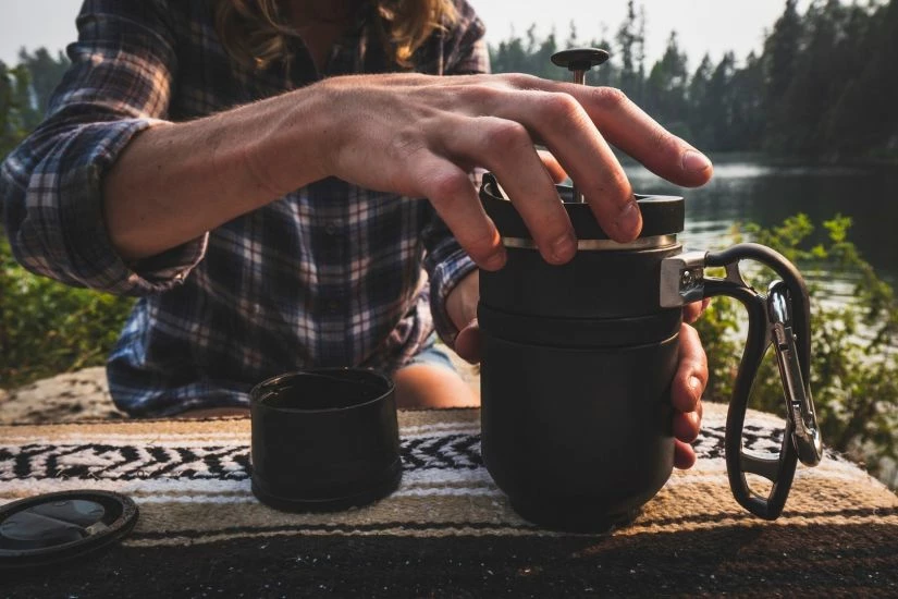 Planetary Design Double Shot insulated travel press – a stainless steel French press mug perfect for brewing coffee and other beverages.
